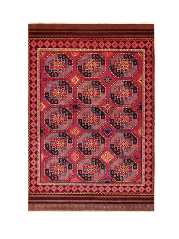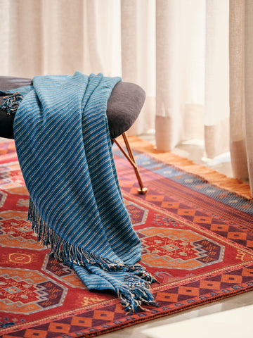 Red Afghan carpets that feature elephant feet patterns are timeless. So we’ve stayed true to this rug tradition while incorporating signature MADE x HANDS motifs. A cornucopia of colors are naturally dyed by hand to create this elegant work of art. Two shades of red and two shades of indigo are accented with turmeric, dandelion, cream and slate. We chose lustrous New Zealand wool to showcase the intricate details of this design. Finished with fringe on one side to dial up the uniqueness.